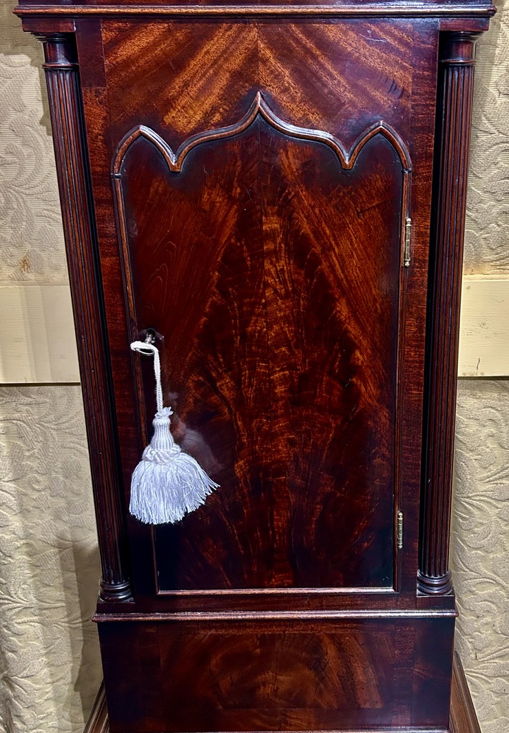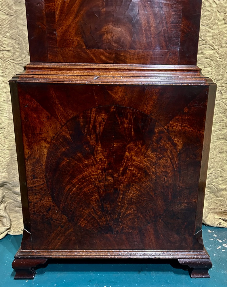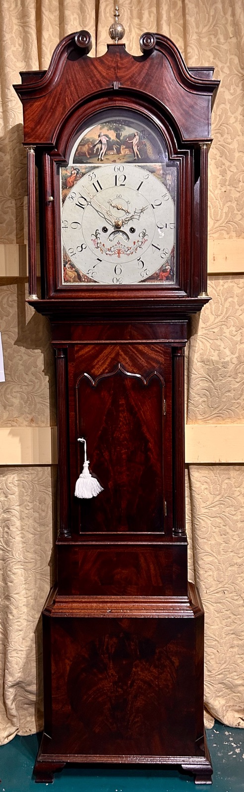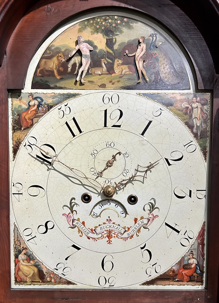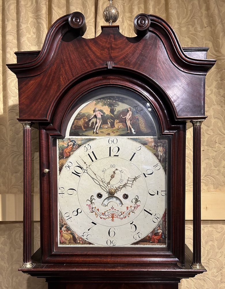 Exceptional mahogany case with swan neck pediment ,the 14 ” painted dial with Arabic numerals has the four seasons in the corners and in the arch automata Adam & Eve also features  seconds subsidiary dial and date aperture with brass hands, the movement is of eight day duration and  strikes the hour and half hour on a bell.